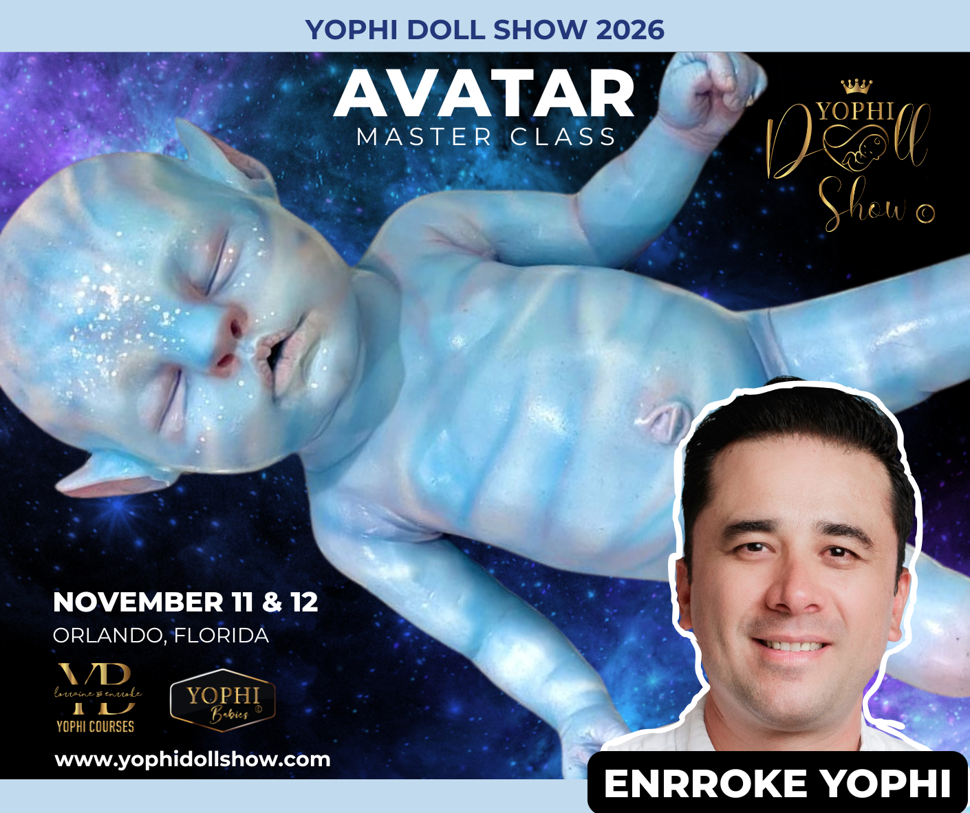 Welcome to the exciting world of reborn baby painting! In this master class, you will have the opportunity to learn how to paint a AVATAR reborn baby, using a special color palette designed specifically for the beautiful baby AVATAR Yophi. This class will be taught by Enrroke and Lorraine Yophi, two experienced artists in the field of reborn baby painting. The class will be held over two intensive days, on NOVEMBER 11 and 12TH, 2026, at the YOPHI DOLL SHOW in ORLANDO, FLORIDA.